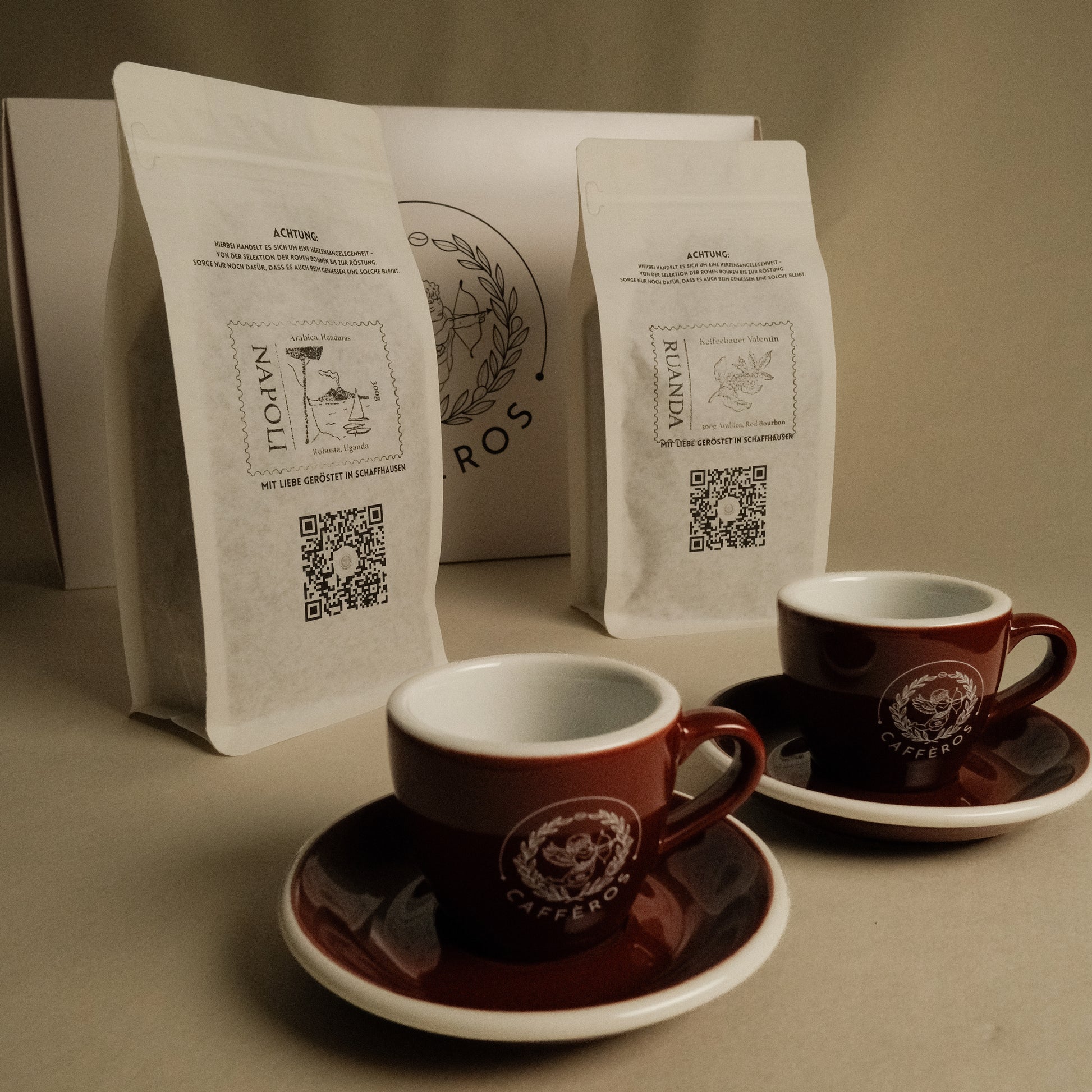 Die CAFFÈROS Weihnachtsbox 2025 vereint unsere Lieblings-Kaffeesorten und hochwertige Espresso-Tassen zu einem eleganten Geschenkset. In der Box findest du zwei frisch geröstete Kaffees à 300 g (Ruanda und Napoli), sowie zwei hochwertige Espresso-Tassen inklusive Untertassen. Alles verpackt in einer schönen, festlichen Geschenkbox.